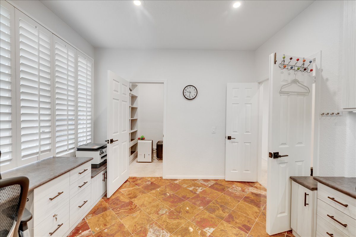 Welcome to “Brisas Del Mar” this stunning solar powered executive-style residence in the heart of Del Mar. As you step through the private front courtyard with a water fountain, you’re welcomed into a home filled with rich Onyx flooring and elegant designer chandeliers. To your left, a spacious office—perfect for working from home or use as a downstairs guest bedroom for visitors or multi-generational living. To your right, a beautiful formal dining area with a fireplace that meets the most sophisticated of needs. The gourmet kitchen showcases an impressive center island perfect for meal prep, gathering, and entertaining—along with maple cabinetry, a side butler’s pantry and food storage. Top-tier LG appliances include a stove, microwave, dishwasher, and double-door refrigerator. Easy flow into the warm, inviting family room with a cozy gas fireplace and surround speakers.